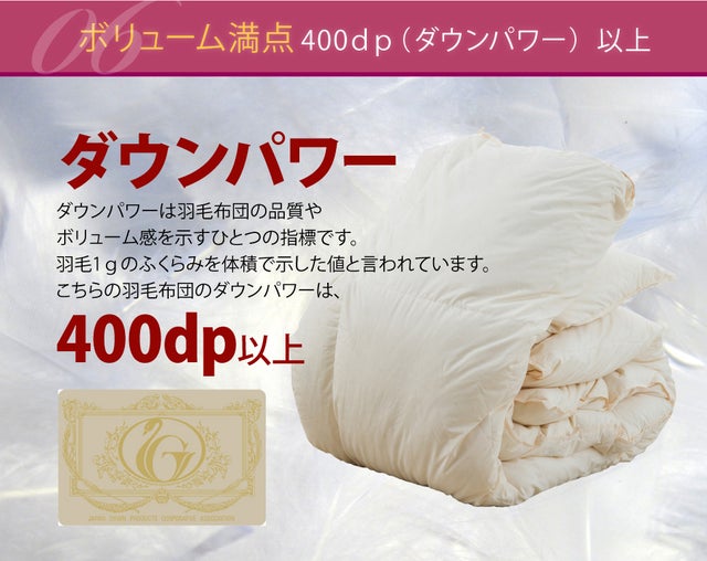 ブルガリア産のホワイトダックダウン93%は、ボリューム満点の400dp(ダウンパワー)以上となっております。