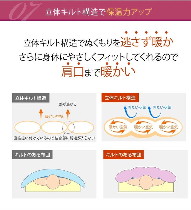 立体キルト構造でむくもりを逃がず暖かく、さらに身体にやさしくフィットする。