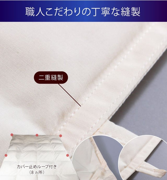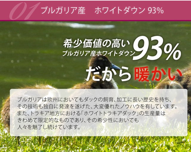 - 上質なブルガリア産ホワイトダックダウン93%を使用。日本人の職人が匠の技で丁寧に仕上げました!