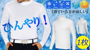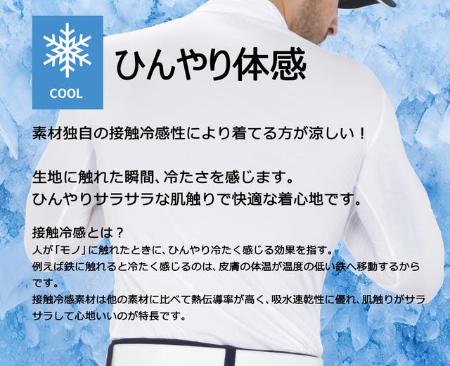 - 素材独自の接触冷感でヒンヤリ体感を、高吸水速乾性素材で汗をかいてもべたつきにくいドライタッチ