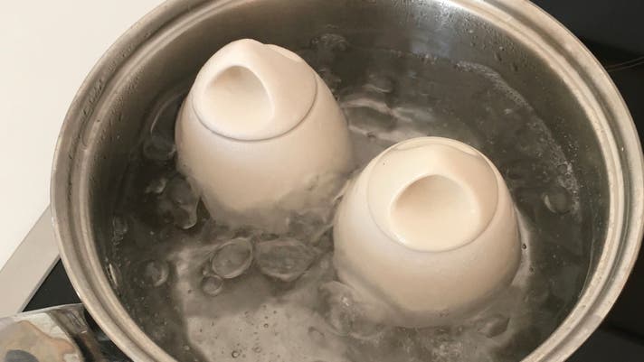 卵と具材を入れてフタを閉めたら、あとはお湯に沈めるだけ。