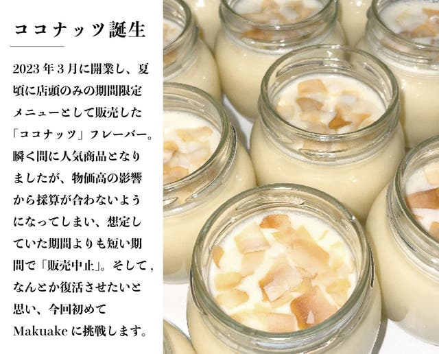 「Makuake(マクアケ)」は、実行者の想いを応援購入によって実現するアタラシイものやサービスのプラットフォームです。このページは、 フードカテゴリの 「【限定で復活】人気だったココナッツ味が蘇る。栄養価の高いEggMilkプリン!」プロジェクト詳細ページです。