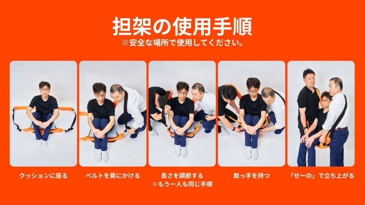 「2人で運べる担架モード。家族や仲間を安全に搬送」