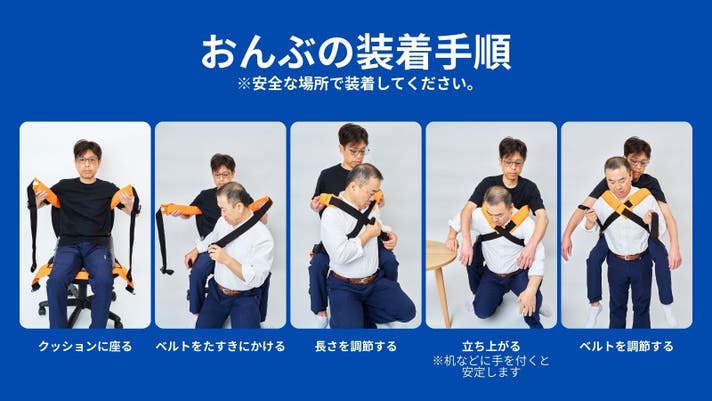 ▶手早く装着可能で、両手が空く状態になり、 おんぶした状態でのドアの開閉、階段の上り下りにも対応できます