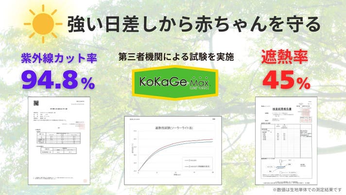 - 熱と紫外線を遮り、赤ちゃんの体感温度上昇を抑える特殊生地を使用