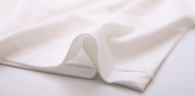 そこからさらに、コンパクト加工という新しい紡績技術によって、毛羽が表側に出ないように撚り込みをかけることで、さらに肌心地のよい布になり、高級Tシャツのような光沢を出すことができます。