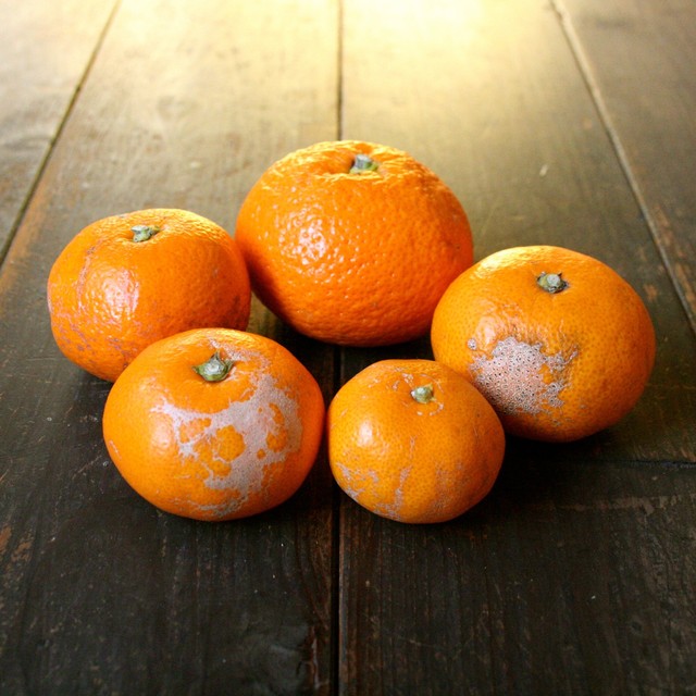 その中でも特に解決したい問題があります。それは、大きさ・形・色等が市場の規格に合わないために価値が激減してしまういわゆる「規格外品(写真のミカンが例)」や、収穫前の青いうちに余分な果実を摘み取る「摘果品」、逆に熟しきってしまう「完熟品」といったものが必ず一定割合発生し、多くの場合捨ててしまうことです。