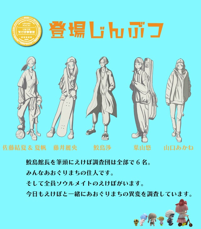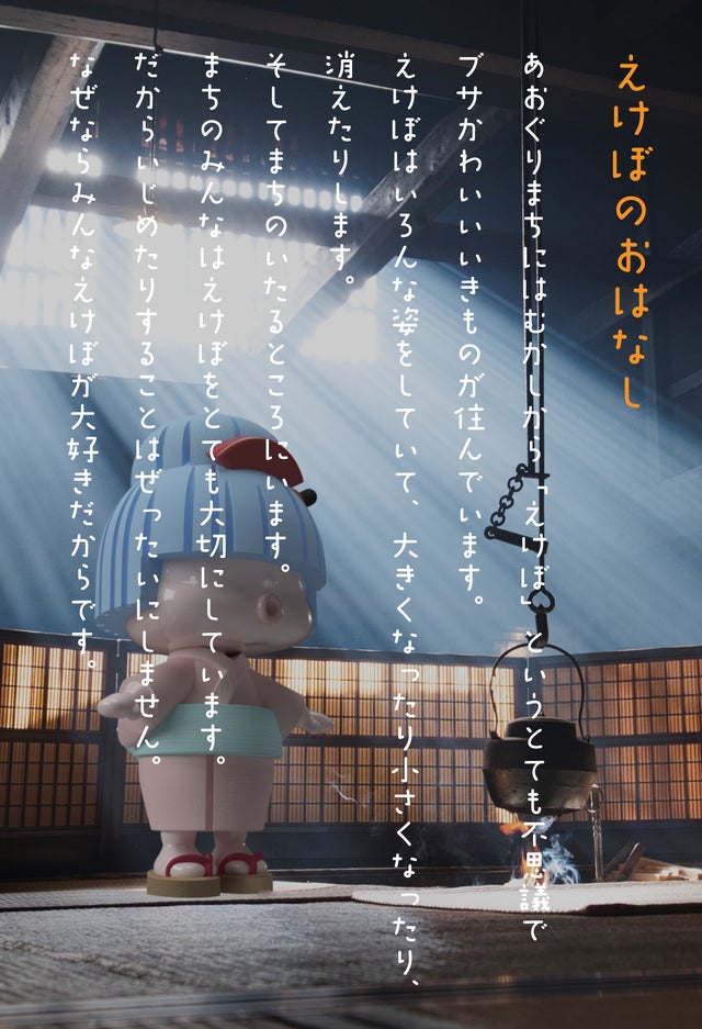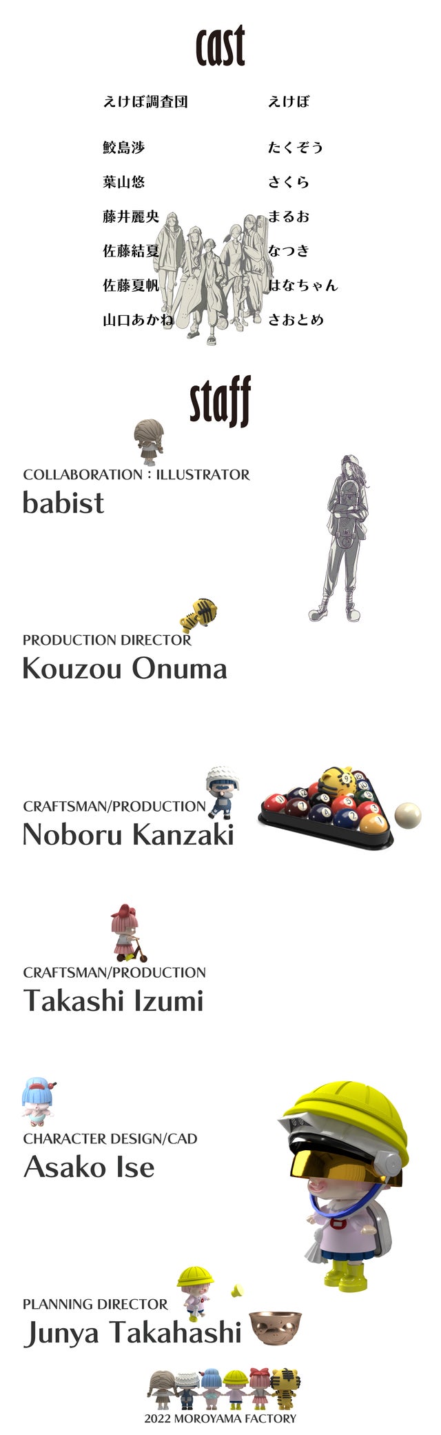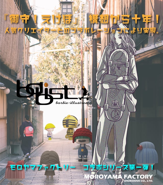 『御守!えけぼ』はあおぐりまちを舞台に不思議ないきもの『えけぼ』とそこで暮らす住人たちのストーリーです。あおぐりまちに登場する人物のデザインはクリエイターの「babist/ばびすと]がデザイン。「MOROYAMA FACTORY」と「babist/ばびすと」とのコラボにより企画が実現しました。