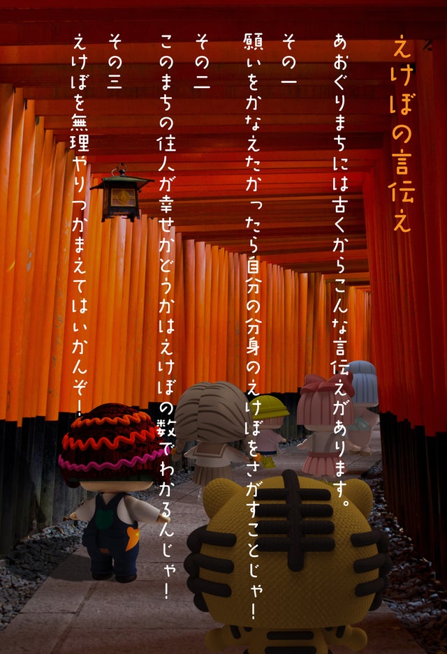 あおぐりまちは昔から住人とえけぼが共存し仲良く暮らしています。しかし最近、あおぐりまちに異変が起きています。この異変に気付いた博士が『えけぼ調査団』を結成しました。異変はどうやら言い伝えにも関係しているようです。この謎を解明し平和なあおぐりまちを取り戻すことはできるのか!?えけぼ調査団の調査記録はSNSでみることができます。