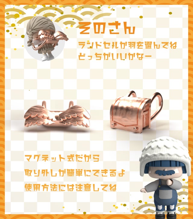 各パーツ:純銅製(各帽子/ランドセル/羽)※ランドセルと羽はマグネットを使用