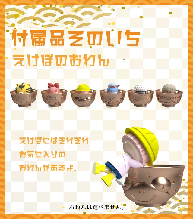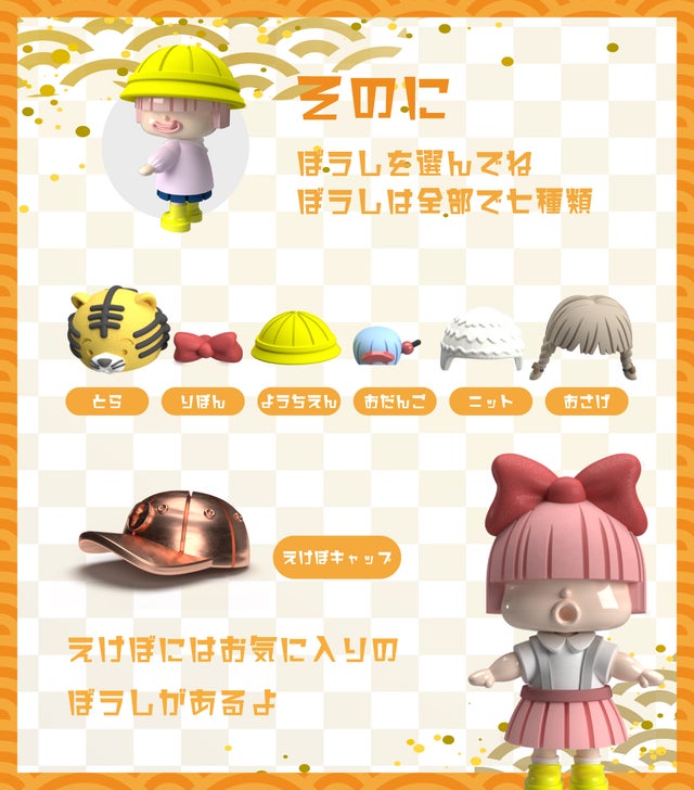 ・ぼうしが選べます。(7種類)※えけぼキャップがひとつセットとして付属します。