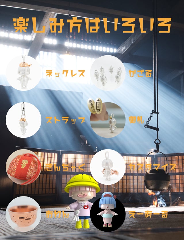 お守り代わりとしていつでも持ち歩けるように3way仕様(ネックレス/チャ-ム/巾着)でご使用ができます。さらに付け替え可能なパーツがたくさん。家にいるときは飾っても楽しい!えけぼ専用のおわんの入れ物付き。御札は20種類の中から好きな御札を選ぶことができます。御札に名入れも可能です。願いを込めてえけぼに投入すれば自分だけのオリジナルお守りが完成!!!