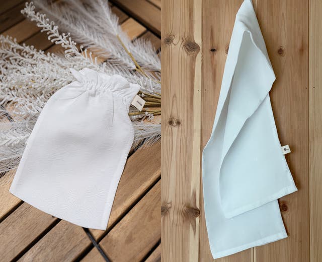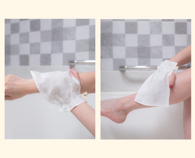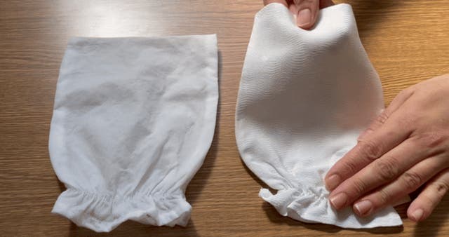 乾いた状態はまるでシルクのような手触りですが、水に濡れると生地に凹凸が生まれ、垢や角質汚れをからめ取ります。低刺激なのに、しっかり角質除去できる秘訣です。