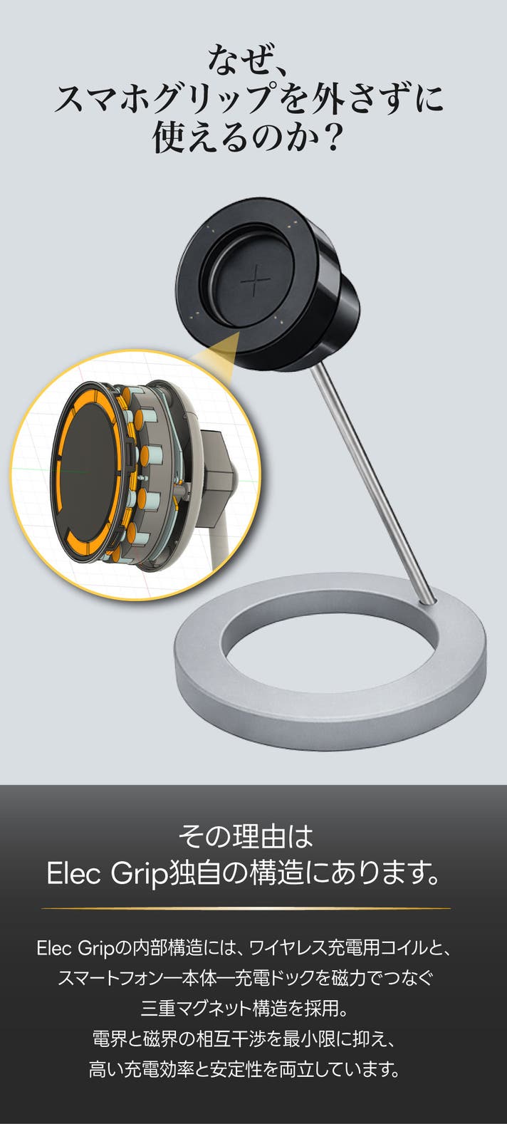 Elec Gripはスマホグリップを外すことなく、ホルダーに置くだけで充電と固定を同時に実現します。1分1秒を大切にする現代人の時間ロスを減らし、取り外したグリップの紛失リスクも防ぎます。