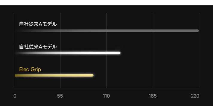 自社従来品ではフル充電まで、Aモデルが約220分、Bモデルが約120分を要していました。 Elec Gripでは、フル充電まで約 90分まで短縮することができました。