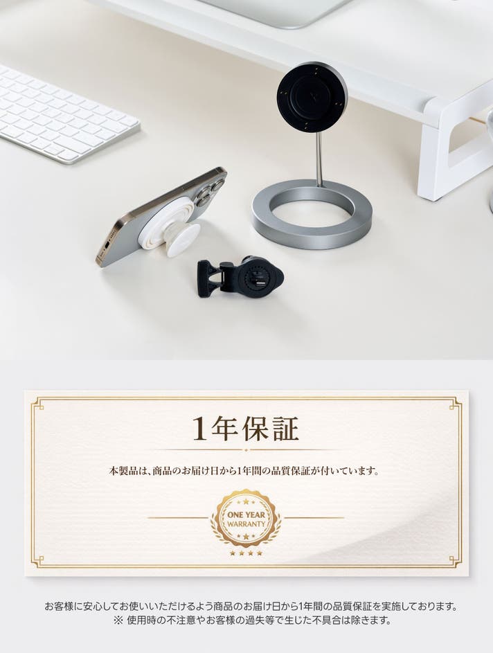 - 最大15Wの高速充電、360°角度調整。厚さ1.4cm・わずか46gの軽量設計
