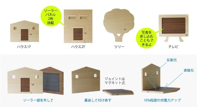 今までの無表情なソーラーパネルとはひと味違います!静岡の木工職人によりひとつひとつを手で作ります。3mmのシナ合板(共芯)を積層して電子部品をカバーした構造になっています。ソーラーパネル面や一部にウォールナットの突板を貼り、アクセントとなるようにしました。表面は天然オイル仕上げです。