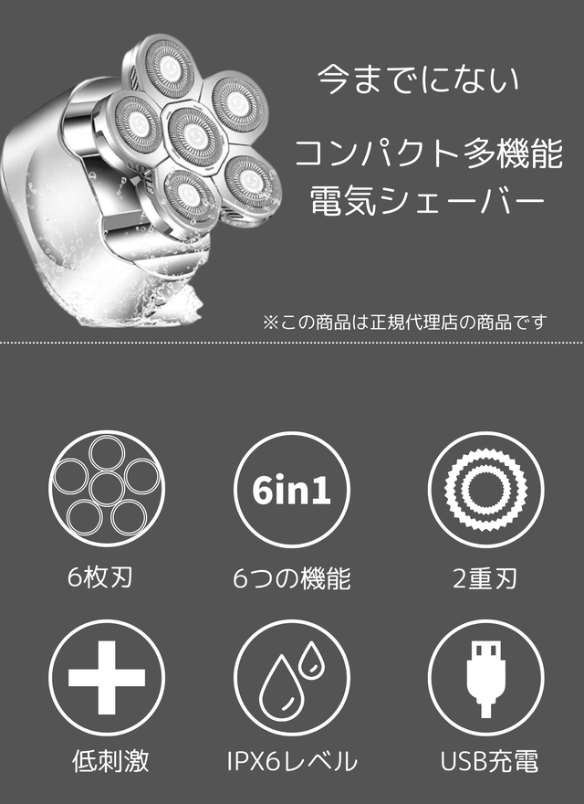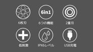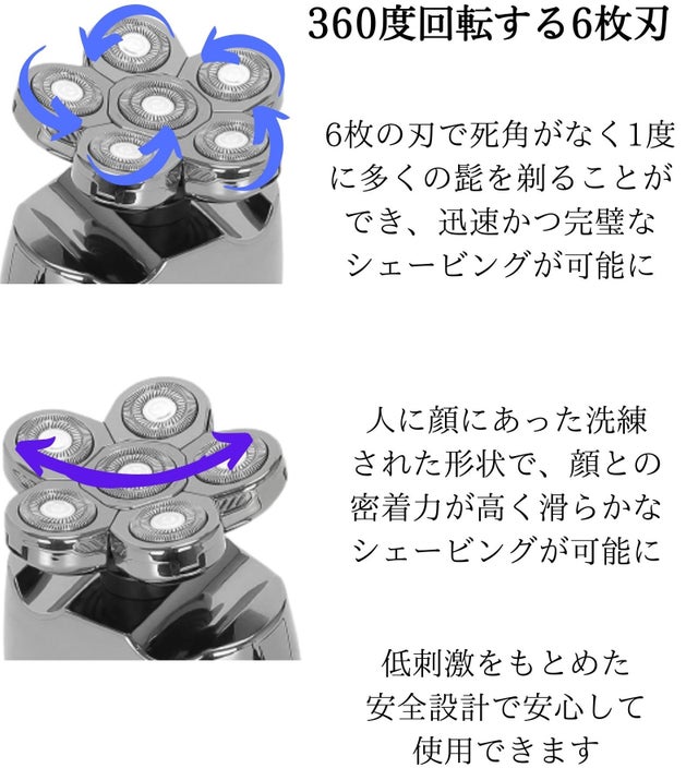 - 人の顔にあった6枚刃で、素早く髭をシェービングすることができます
