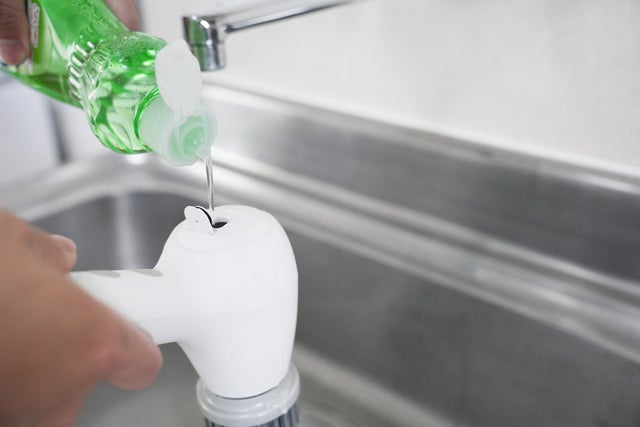 本体に洗剤タンクがついており、上部の穴を開けて、洗浄液を加えることができます。使用時にボタンを軽く押すとブラシの中心から流出することがあります。