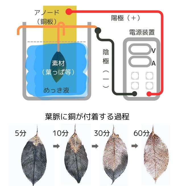 電気めっき技術で、植物や天然石、その他さまざまな素材に「銅」を付着させる技術です。