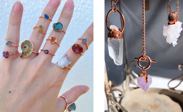 原石や穴の空いていない天然石に金属枠を付けてパーツを作ったり