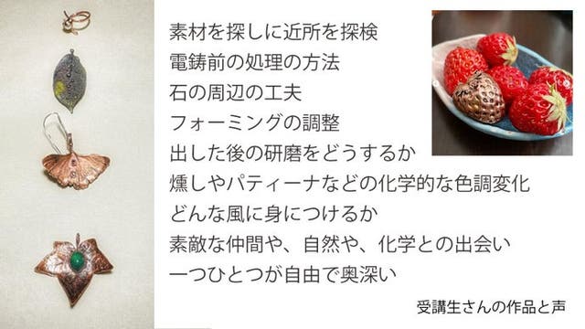 植物、天然石、布、昆虫など、形あるものに「銅めっき」を施して作るハンドメイド技法【エレクトロフォーミング】で制作した卒業生さんの作品をご紹介します。
