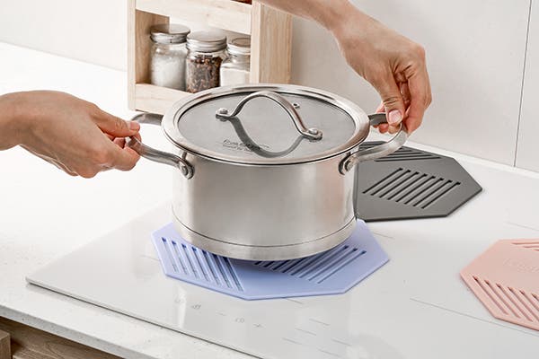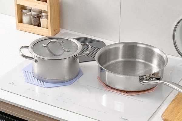 裏面には特殊な滑り止め加工が施されており、滑らかなトッププレートでもその場からびくとも動きません。また、表面には滑り止め用の波型模様が施されており、調理中の鍋やフライパンが動かないようしっかりホールドします。