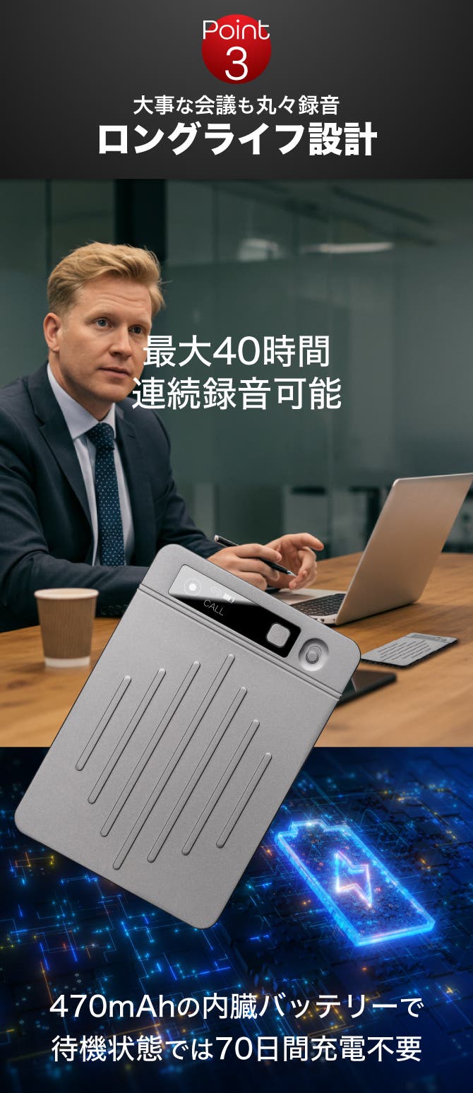 薄く小さなボディーには470mAhのリチウムイオン電池を搭載しています。省電力で動作が可能なため、待機状態では70日間充電不要です。また、最大で40時間の連続録音も可能なので、どんなに長い会議でも丸々収録可能です。