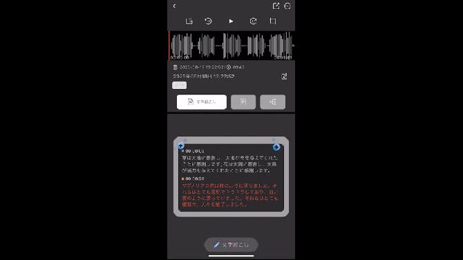 収録したファイルをアプリで開き、文字起こしボタンを押せば即座に文字起こしが可能です。