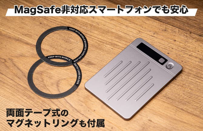 お持ちのスマートフォンがマグセーフに対応していなくても問題ありません。付属の両面テープ式のマグネットリングを使用すれば、どんなスマートフォンにも装着いただけます。また、MagSafeの装着具合が緩いと感じられた場合は、このマグネットリングをプラスで使用すればしっかりと装着することも可能です。
