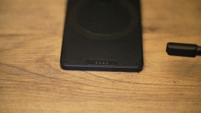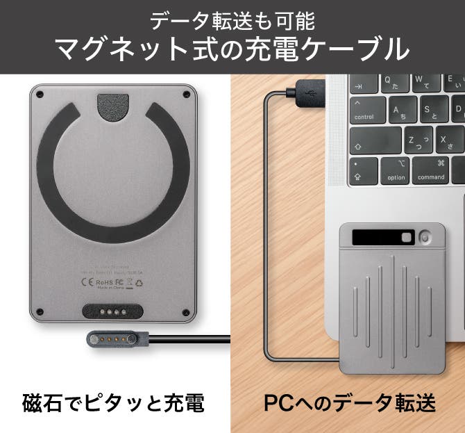 付属の充電ケーブルは片側はUSB typeA、片側はピタッとくっつく独自端子となっています。