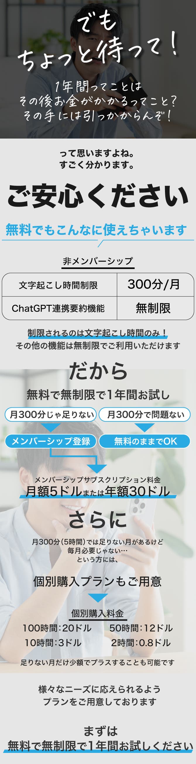 1年を過ぎても、無課金で月300分の文字起こし制限制限があるだけで、その他の機能は全てご利用いただけます。