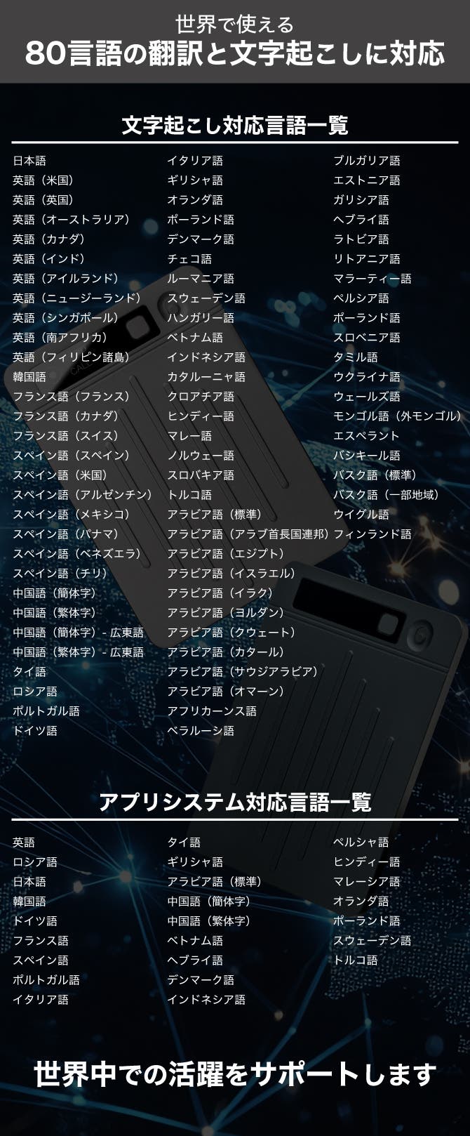 様々な国の言語に対応しています。文字起こしに対応している言語は80。アプリは25もの言語に対応しているため、世界中でご利用いただけ、世界中の人とのコミュニケーションのツールといっても過言ではありません。