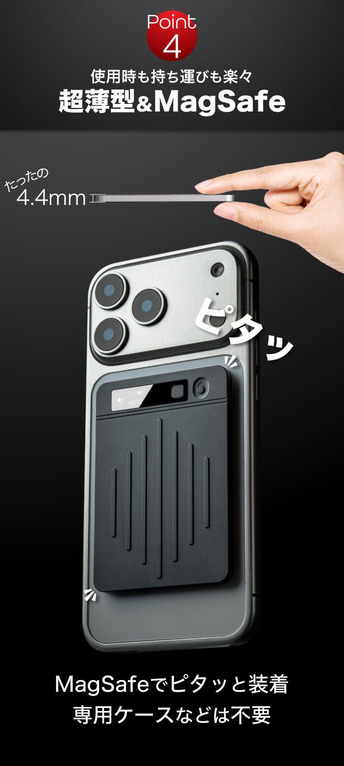 さらに、MagSafeに対応しているので、MagSafe対応のスマートフォンであればケースなど余計なものは不要で、そのまま装着することが可能です。