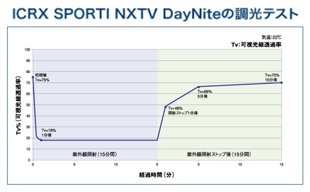 (気温22℃での紫外線照射テストの場合)※紫外線量、気温によって可視光線透過率が80%~20%に変化します。
