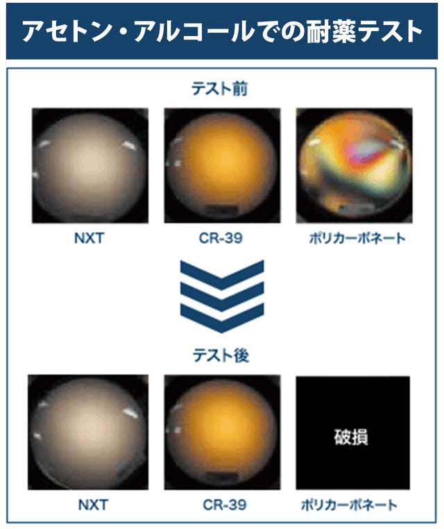 傷に強いうえ、優れた耐薬品性を持ち、日々の様々なリスクによるレンズ破損をガードします。マニキュア落としなどに配合されているアセトン、消毒薬として一般的なアルコール等、身近に存在する薬品に対しても優れた耐破損性を発揮します。