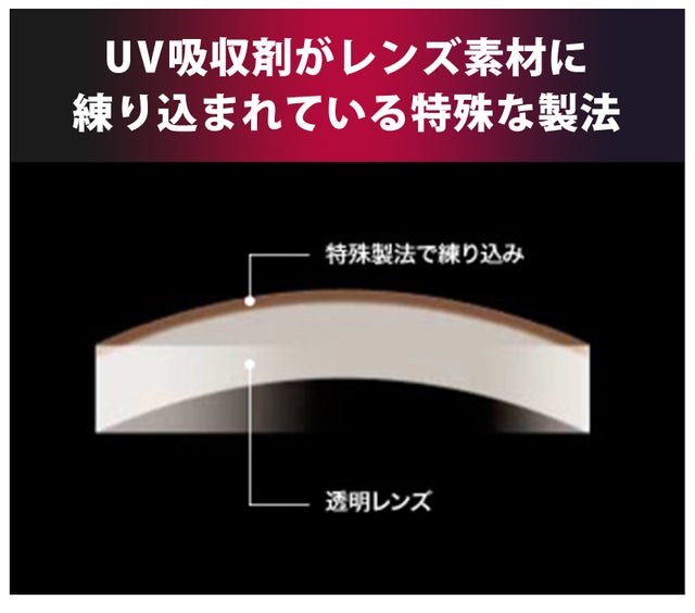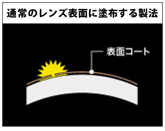 通常のサングラスレンズを製造する場合、カラー染料や調光のための添加剤をレンズ表面に塗布する方法が一般的で、そのため衝撃により表面のコーティングが剝がれやすくなります。