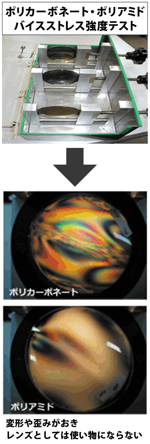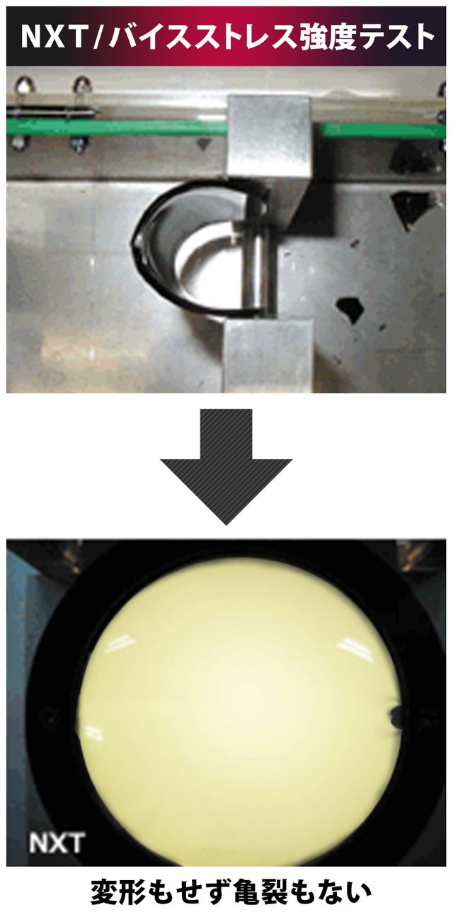 あらゆる強度テストで他のレンズは使用不可能になるのに対して、NXTはその優秀性をいかんなく発揮。専用のバイスストレスをかけた強度テストにおいても、NXTは形状記憶しているかの如くもとの形状に戻っています。しかもレンズには、歪みで生じる亀裂やヒビ等が全く入っていません。