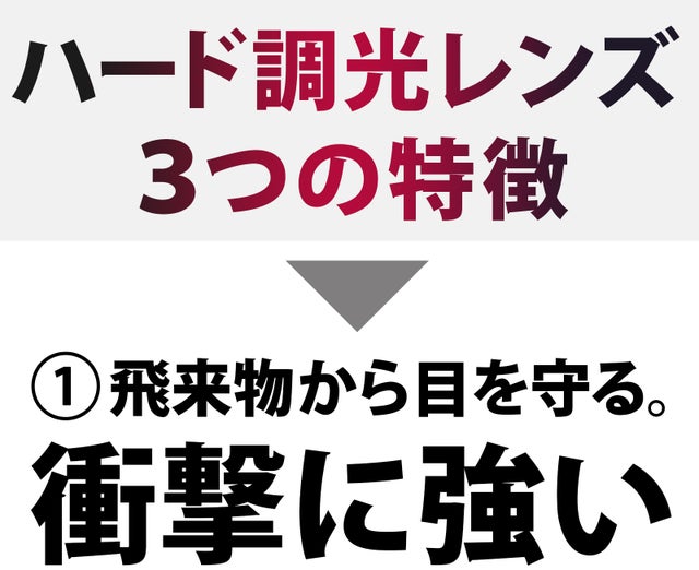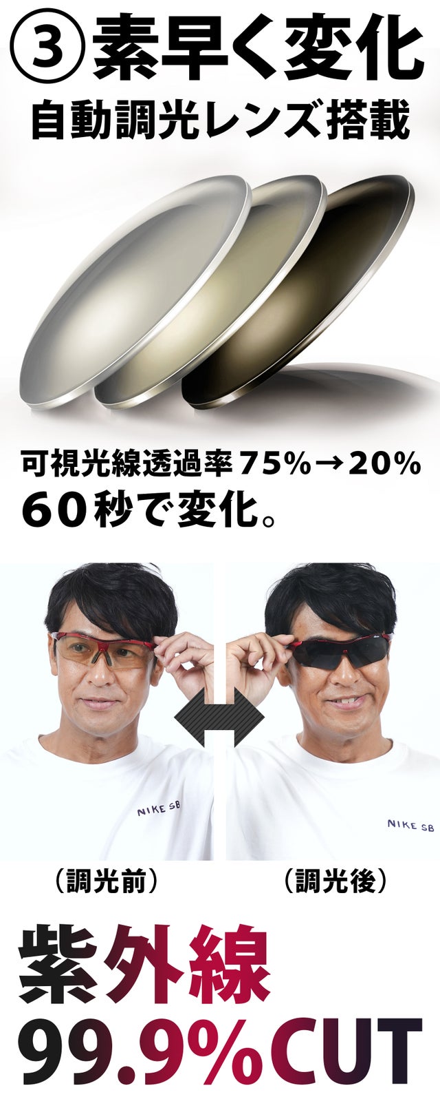 米陸軍の開発プロジェクトから生まれた防弾マテリアルで、耐衝撃性に優れた形状記憶素材。さらに耐薬品性にも優れ、傷がつきにくく歪みを抑え、見やすさを維持します。またUV吸収剤をレンズに練り込んでいるため半永久的にUV効果が持続し、より早くより濃淡に変化する調光機能が最適な視界と明るさを確保します。