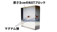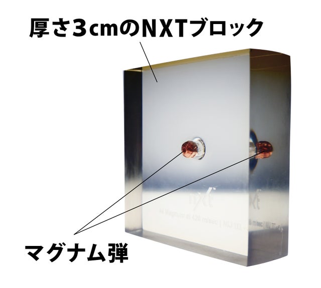マグナムで1mの至近距離から厚さ3cmのNXTブロックに発砲。貫通することなく衝撃を吸収しています。