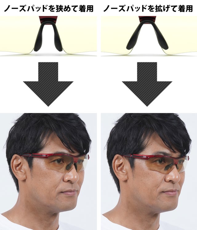左の写真は、ノーズパッドを狭めて着用しており、ノーズパッドを狭めた分サングラスの装着位置が高くなり眉毛が隠れます。右の写真は、ノーズパッドを拡げて着用しており、左の写真に比べてより深くサングラスを装着し、レンズと頬の隙間が狭くなっています。
