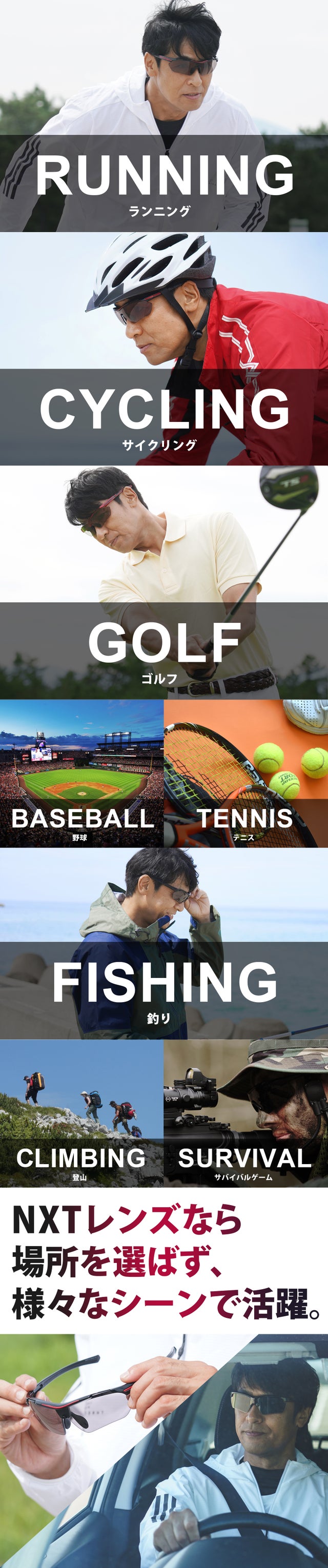 レンズ強度だけでなく、見やすさも優れた(アッペ数45)NXTレンズ。たった60秒で可視光線透過率75%(淡色)から20%(濃色)まで変化するので、あらゆる気象状況下で防眩効果と最適な視界の明るさを確保します。たいへん見やすく、最高のパフォーマンスを発揮するために欠かせない理想のスポーツサングラスです。