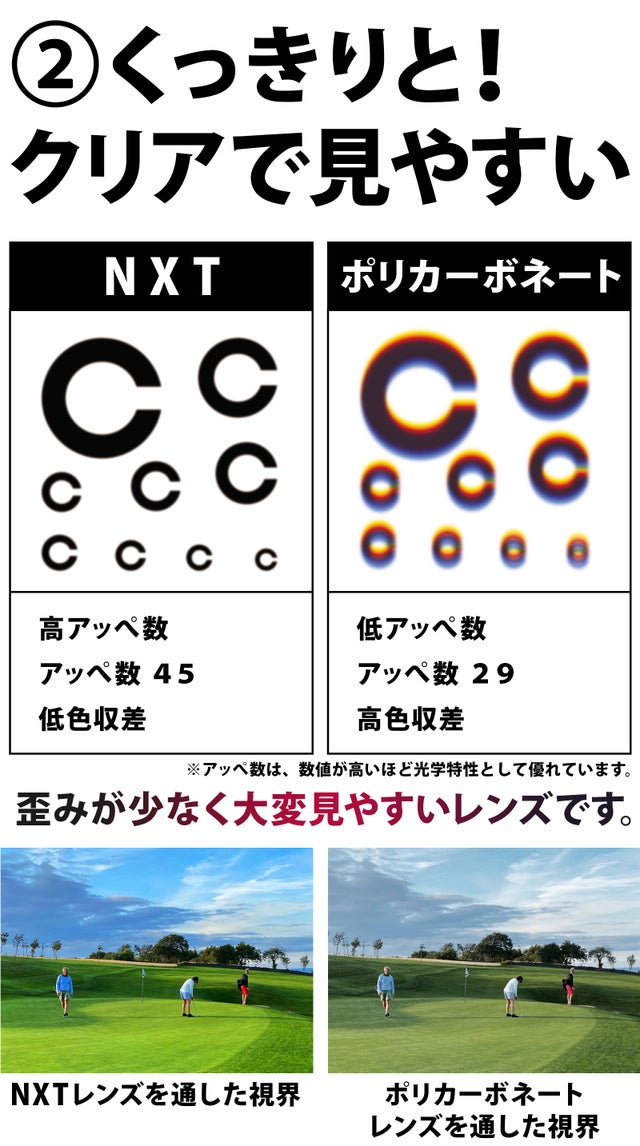 NXTレンズは、染料や添加剤を素材に練りこんで製造することで、衝撃により多少の傷が付いた場合でも、色むらや色抜けを起こしません。またUVも99.9%以上カットし、UV吸収剤がレンズ素材に練り込まれているため、半永久的にUVカット機能が持続します。