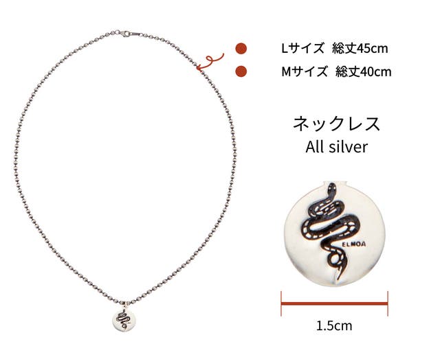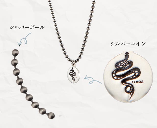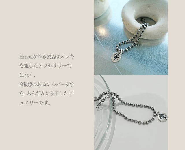 ELMOAの蛇ジュエリーはシンプルながらも洗練されたデザイン。シルバー925の素材の美しさが引き立つようにデザインしました。シルバー925は「輝き」と「エイジング」の両面を長く楽しめる、一生物とも言える素材です。