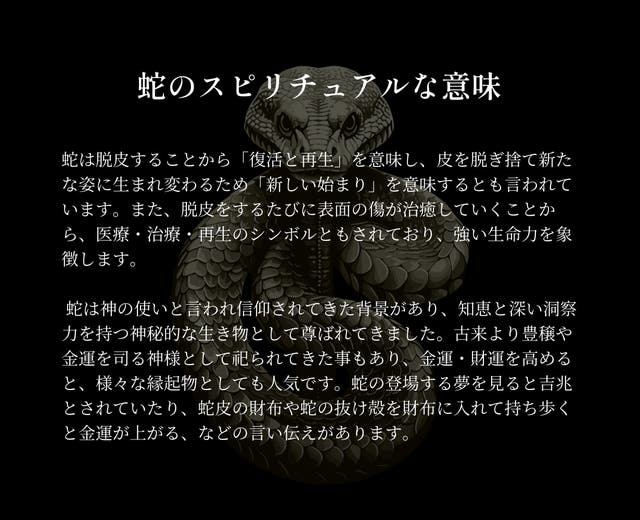 蛇は風水や干支において、スピリチュアルの意味合いの強い動物と言われています。脱皮をすることから「新しい出発」を意味したり、神の使いとして神聖視されてきました。運気を上げる縁起物として、生命力を象徴するシンボルとしても認識されています。