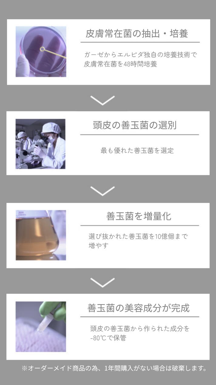 そこで私たちは、あなたの頭皮から善玉菌※を採取し、その菌をもとに製品を製造。