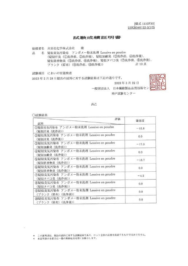 アンボメー粉末洗剤「 Lessive en poudre」で洗濯後の消臭効果を実証すべく、弊社にて洗濯後(一財)日本繊維製品品質技術センターにてニオイの官能検査を実施。代表的なニオイに対して消臭効果があることが証明されました。