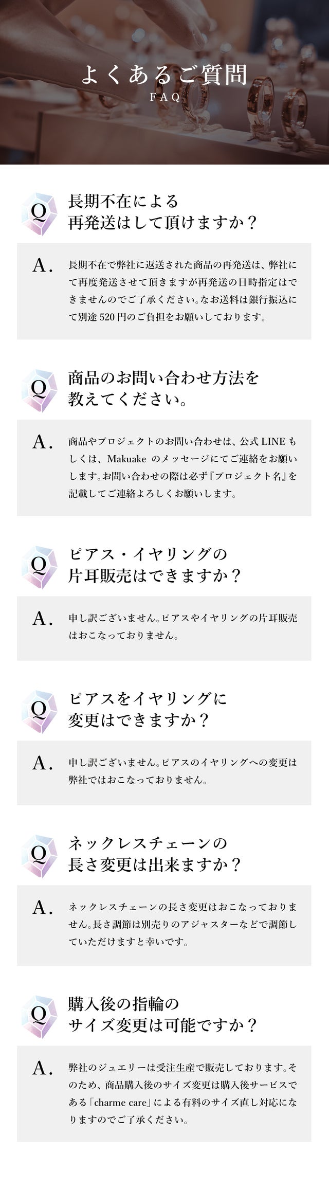 私たちは【シャルムジュエリー】を制作するために、工場とデザイン・仕様を実現できるよう、プロジェクトを誠心誠意進めています。 しかしながら開発中の工程において、デザイン・使用が一部変更になる可能性もございます。製造スケジュールについては、プロジェクト成功を想定した数で調整しておりますが、想定を上回る応援の申し込みがあった場合、製造や発送に伴うやむを得ない事情によりお届けが遅れる場合がございます。上記のようにプロジェクトページに記載している内容に変更がある場合は、活動レポートなどで共有を行っていく予定です。 本文中に記載させていただいたスケジュールは、あくまでプロジェクト公開時点の予定です。応援購入の性質上、配送遅延のおそれがございます。 原則として、配送遅延に伴う応援購入のキャンセルはできませんが、リターン配送予定月から3ヵ月を超えた場合には、希望者に限りキャンセルにて対応させていただきます。