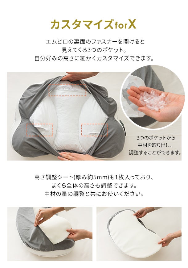A. エムピロXのサイドが盛り上がっているのは、そんな横向き寝派のあなたのためです。横向き寝の際の高さの目安としては、「肩先から耳までの距離」が「エムピロXのサイド部分の高さ」と合っているかご確認ください。