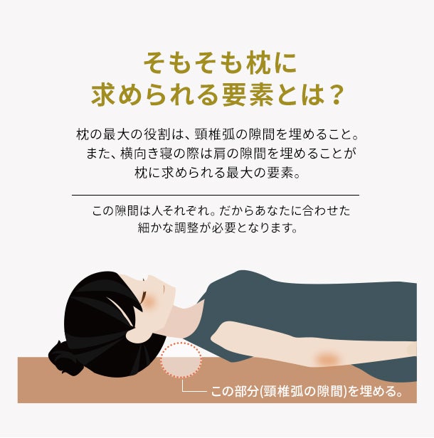 敷き寝具と後頭部や側頭部、首や肩の間を埋めること。隙間ができるだけ生まれないようなトータルコンタクトの状態が望ましい姿です。